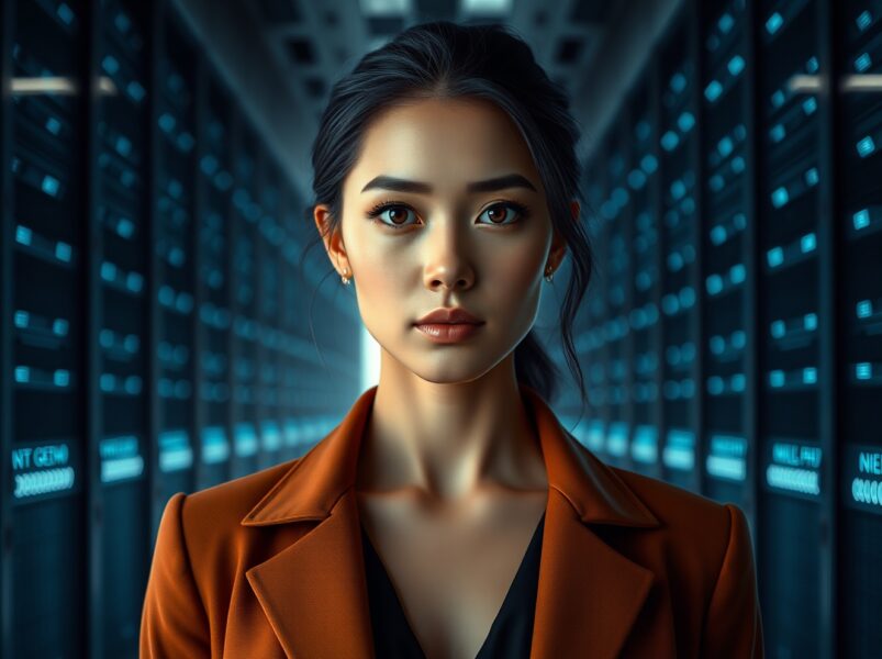 AI actor Tilly Norwood, a digital character, in a data center setting representing synthetic media creation.